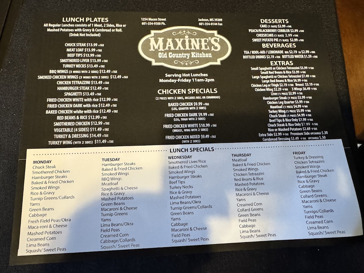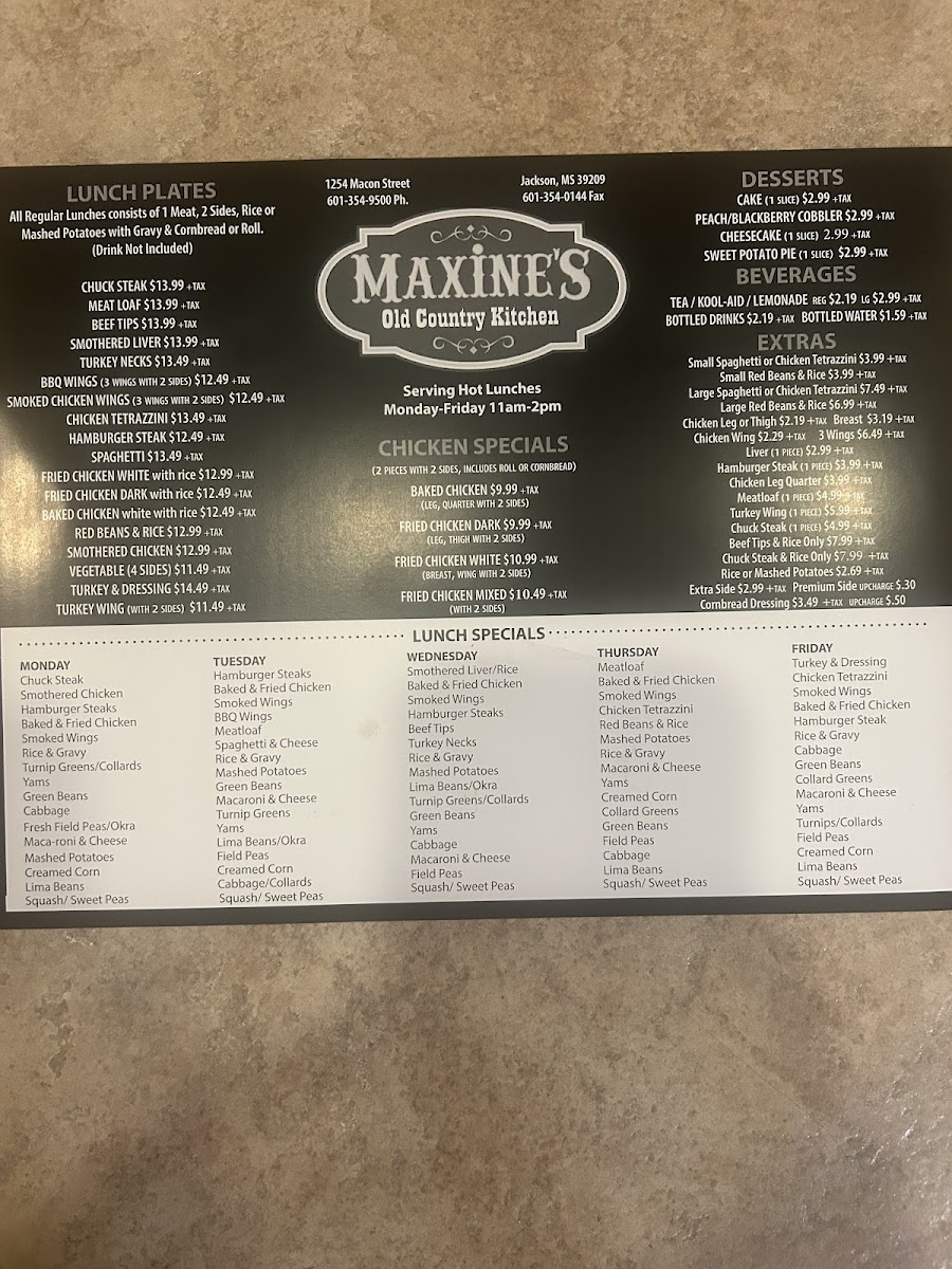 If you’re looking for a hearty, home-cooked meal in Jackson, MS, the Maxine's Old Country Kitchen Menu has everything you need to satisfy your cravings. Nestled on Macon Street, this cozy spot brings you a taste of down-home Southern comfort, with dishes that feel like they were made in someone’s kitchen just for you. Whether you're in the mood for crispy fried chicken, creamy mashed potatoes, or a warm slice of cornbread, the menu here offers a variety of flavors that will remind you of a Sunday family gathering. The food is always fresh, the portions are generous, and the atmosphere is welcoming, making it the perfect place to enjoy a meal with friends or family. From breakfast to dinner, there’s something on the menu to please every palate, so take a seat, relax, and dive into the comfort food that Maxine's is known for.